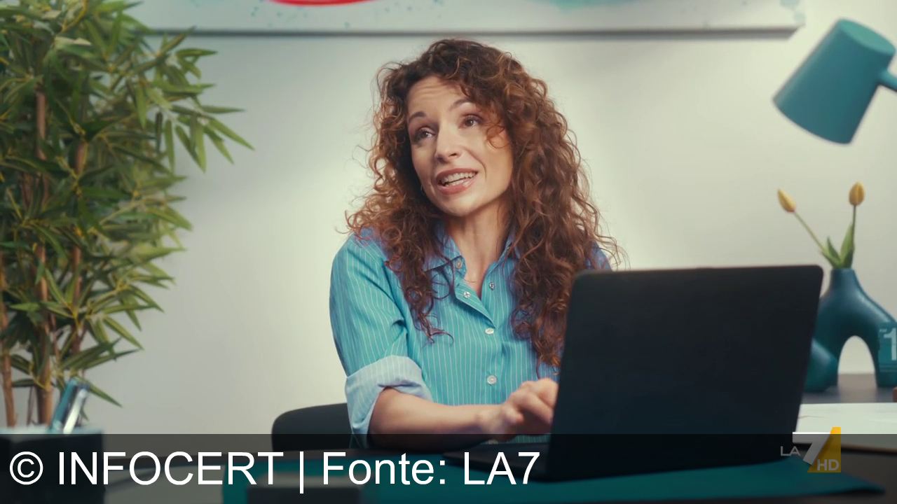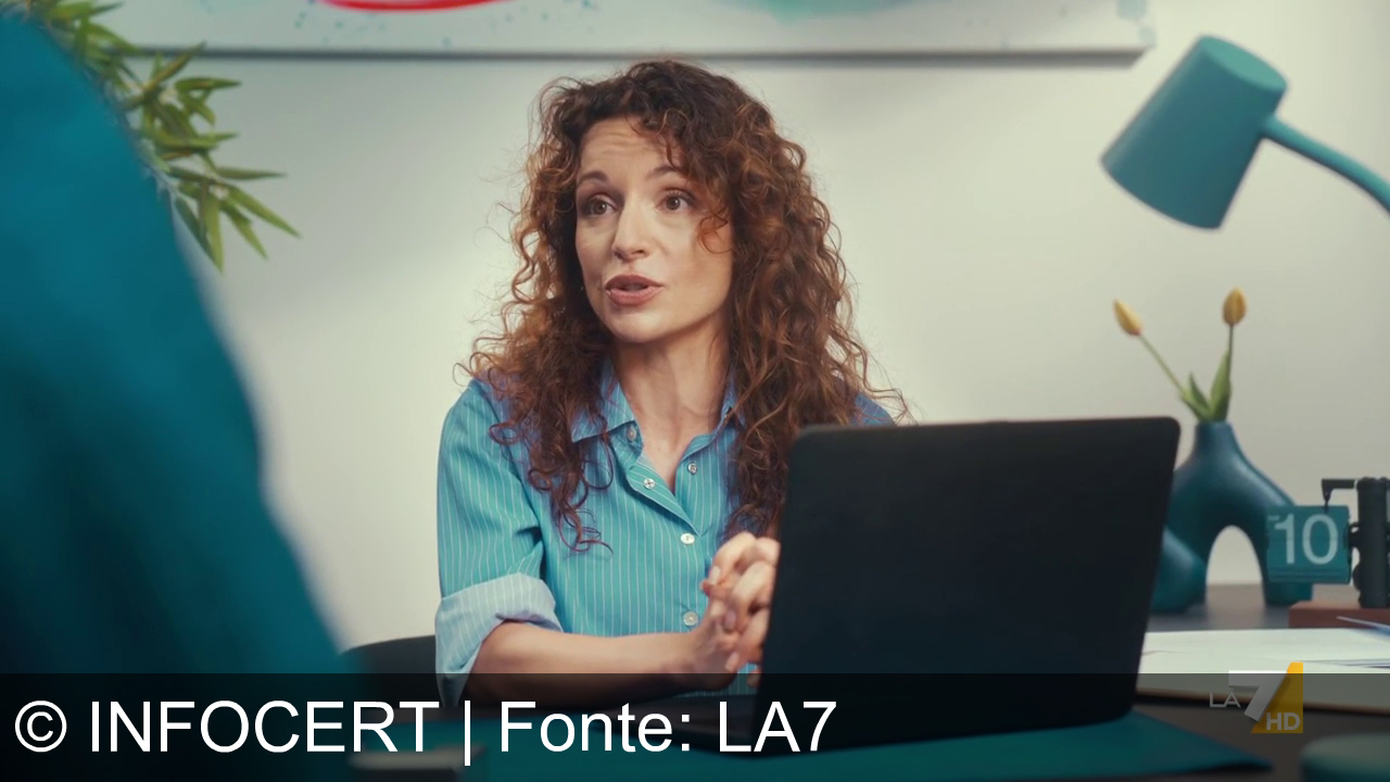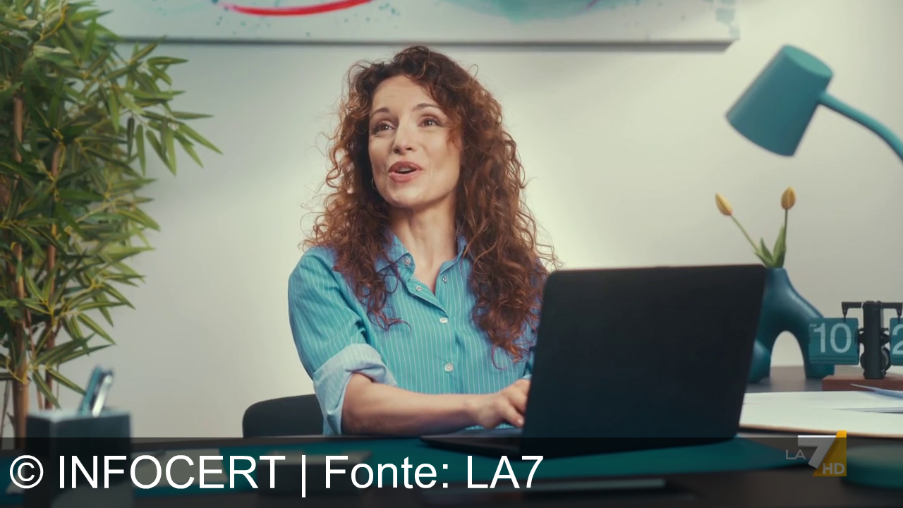 Donna sorridente con capelli ricci, in camicia blu, sta lavorando al computer. Nell'ufficio ci sono una pianta, una lampada blu e un vaso con fiori gialli. In basso a destra, logo "LA7 HD" bianco e giallo.