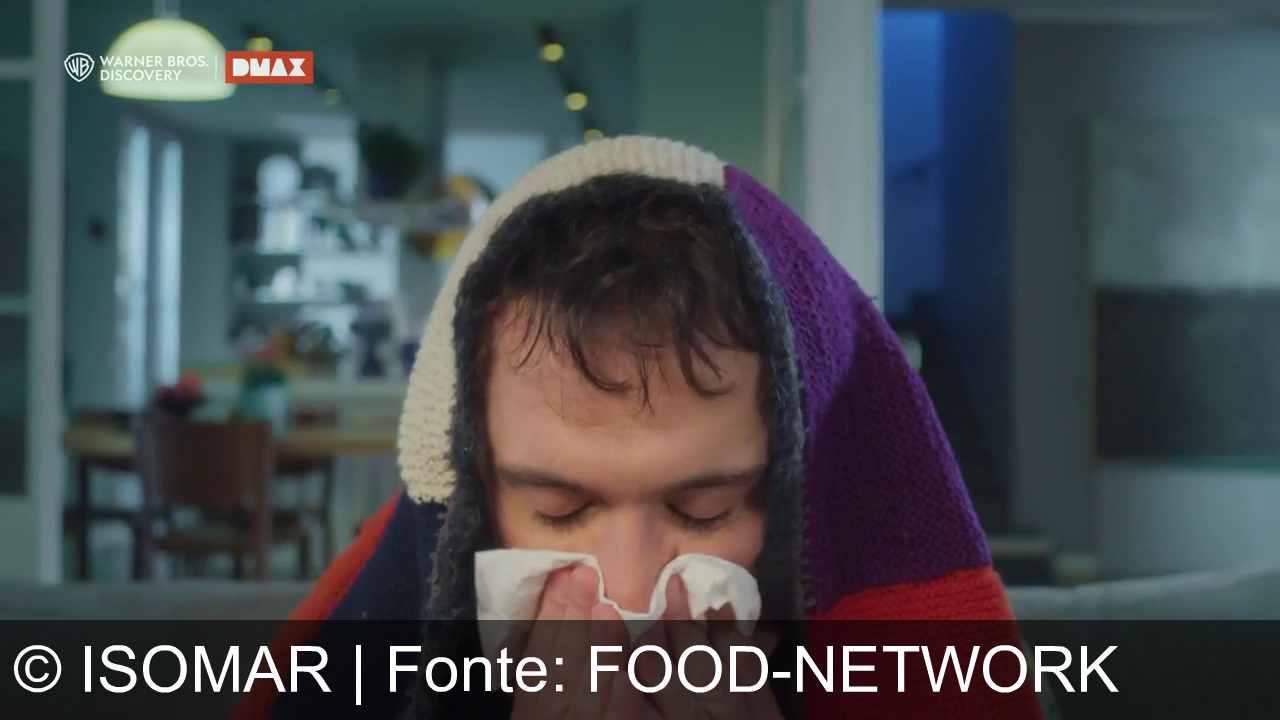 Un uomo seduto si copre con una coperta colorata. Sta usando un fazzoletto per soffiarsi il naso. Dietro, c'è una cucina sfocata con luci accese. Nell'angolo in alto a sinistra ci sono i loghi di Warner Bros. Discovery e DMAX.