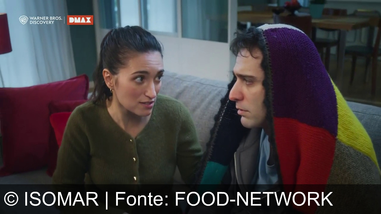Due persone sedute su un divano. Uomo con coperta a righe colorate sulla testa tiene scatola di medicinali. Donna con coda di cavallo, vicina a lui, guarda verso di lui. Ambiente interno con mobili sullo sfondo. Logo Warner Bros. Discovery DMAX in alto a sinistra.
