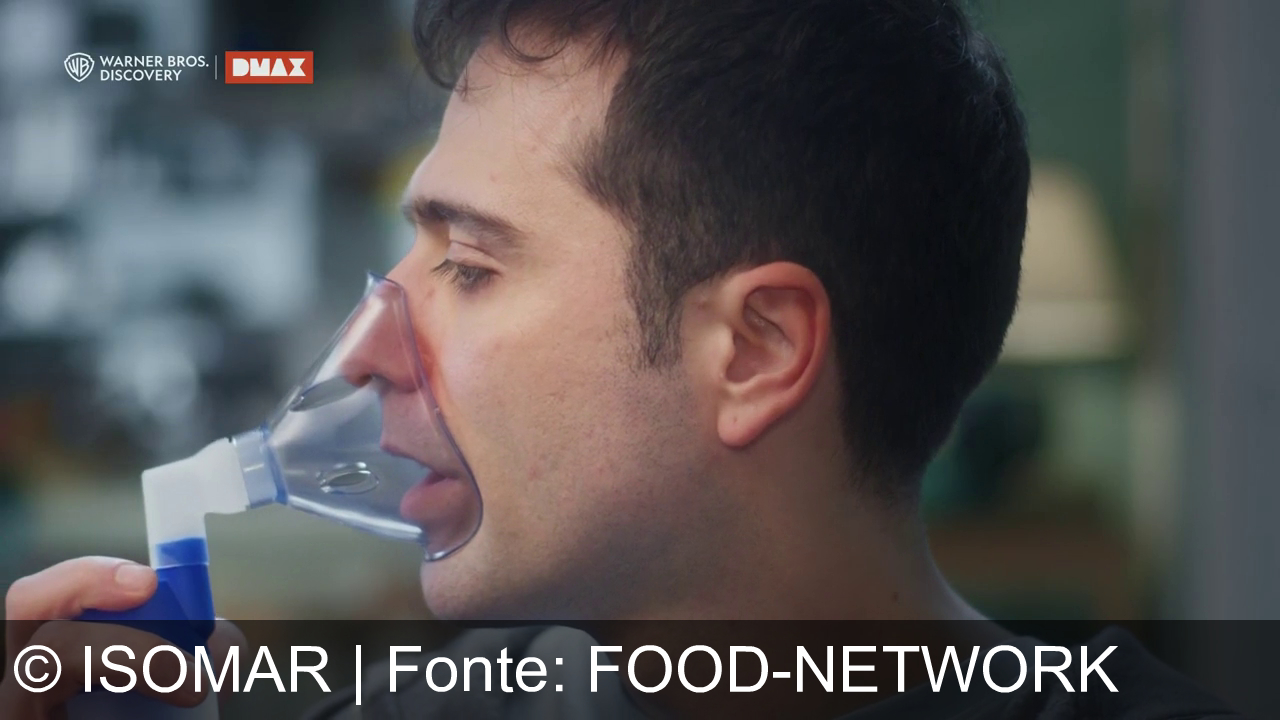 Un uomo usa un nebulizzatore, tenendo la mascherina trasparente sul viso. Sullo sfondo sfocato, si intravedono oggetti domestici. In alto a sinistra, loghi di Warner Bros. Discovery e DMAX.
