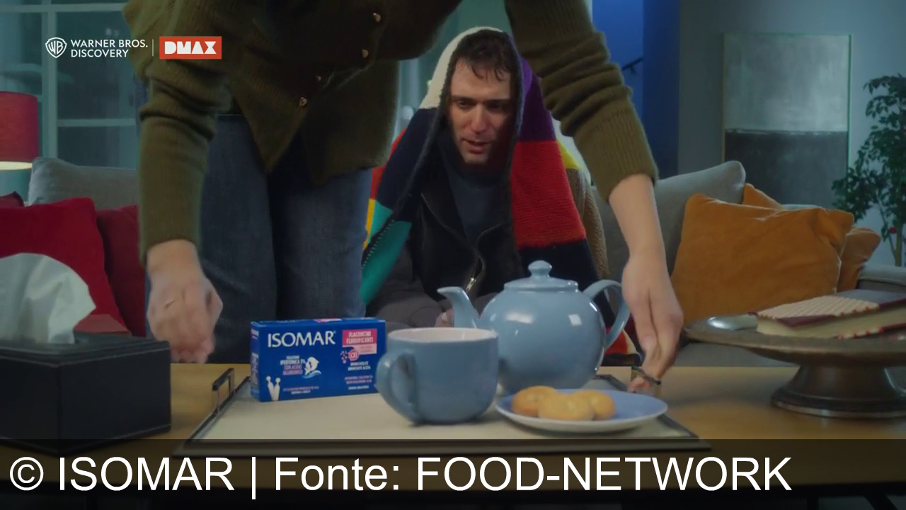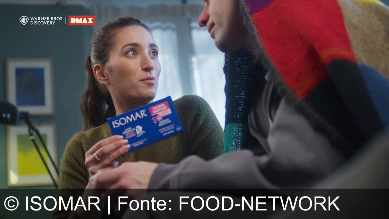 Una donna tiene in mano una confezione di Isomar mentre parla con un uomo avvolto in una coperta colorata. Entrambi sono seduti in un ambiente interno, con una lampada e dei quadri sullo sfondo. Nell'angolo in alto a sinistra ci sono i loghi di Warner Bros. Discovery e DMAX.