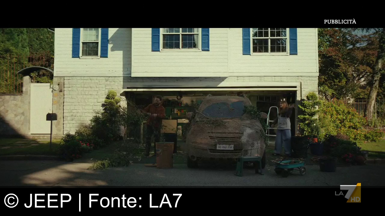 Un vialetto di un quartiere residenziale al tramonto. Ci sono diverse case e alberi lungo la strada. Al centro della scena, "Jeep" è scritto in grande. Nell'angolo in basso a destra, "La7 HD".