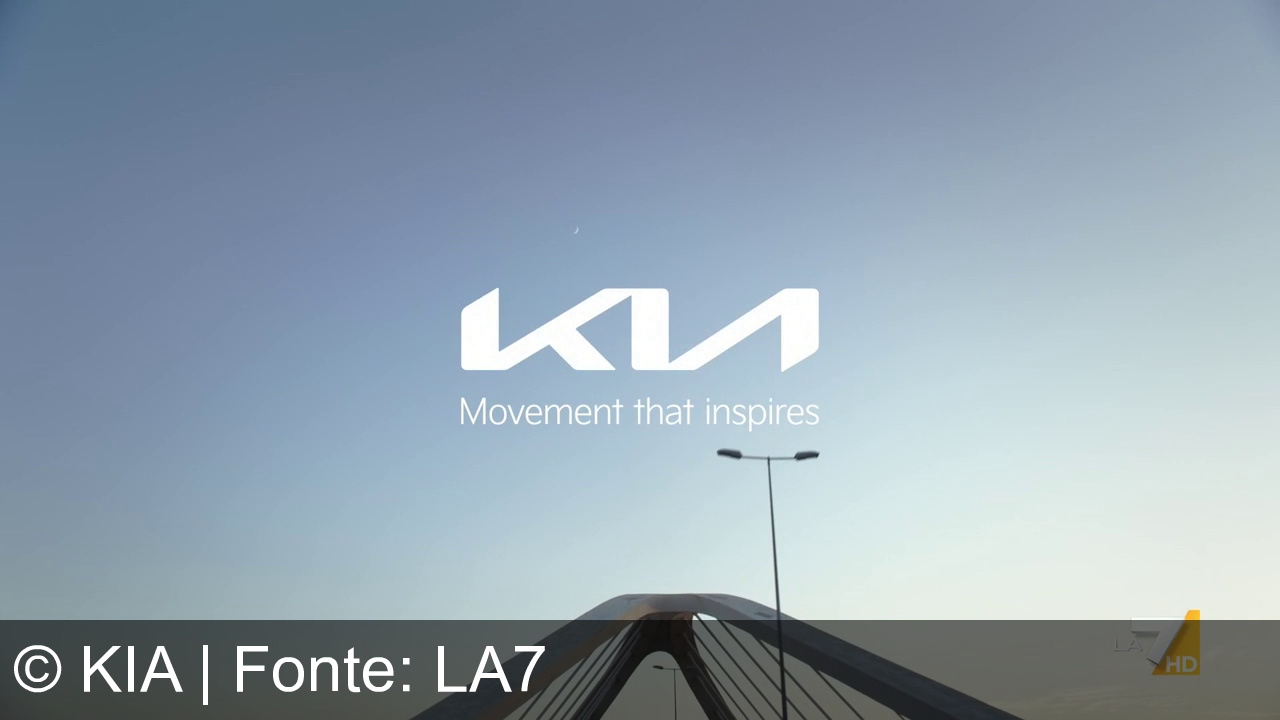 Il logo della Kia al centro, con la scritta "Movement that inspires" sotto. Uno scorcio di ponte con cavi e un lampione centrale, cielo azzurro sullo sfondo. In basso a destra c'è il logo di un canale televisivo.