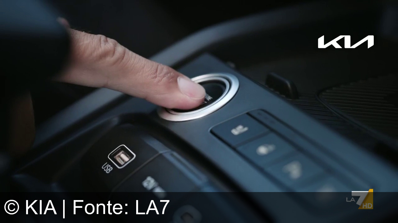 Un dito preme il pulsante di accensione su una console centrale di un'auto. Vicino ci sono una porta USB e alcuni pulsanti. In alto a destra c'è il logo Kia e in basso a destra il logo La7 HD.