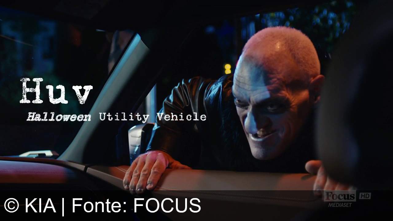 Un uomo con pelle chiara e tratti somiglianti a un mostro ride attraverso il finestrino di un'auto. Indossa una giacca di pelle. Sul lato sinistro, c'è il testo "Huv Halloween Utility Vehicle". Nell'angolo in basso a destra, ci sono i loghi di "Focus HD" e "Mediaset".