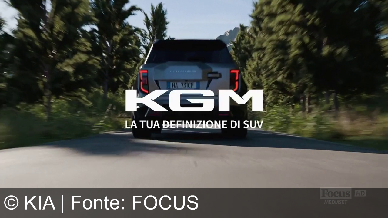 Un SUV nero percorre una strada circondata da alberi. Sullo schermo c'è la scritta grande "KGM" e sotto "La tua definizione di SUV". In basso a destra ci sono i loghi "Focus HD" e "Mediaset".