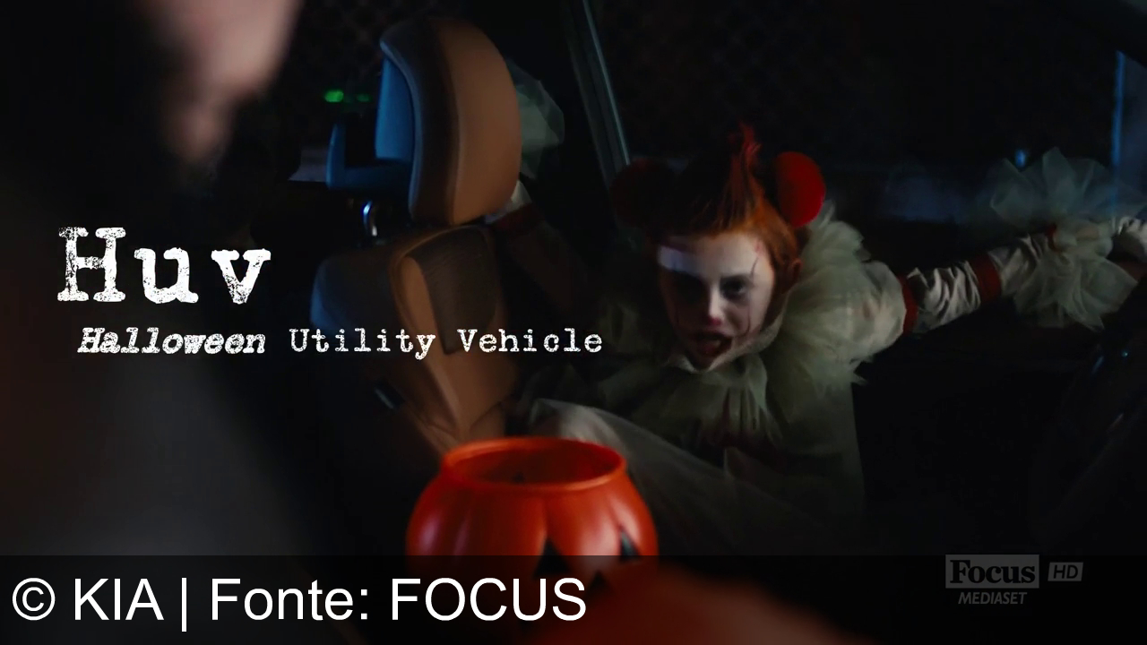 Una persona truccata da clown con i capelli rossi è seduta all'interno di un'auto. C'è un secchio arancione a forma di zucca sul sedile. Testi in sovrimpressione indicano "HUV Halloween Utility Vehicle". Nella parte inferiore destra, i loghi "Focus" e "Mediaset". L'immagine è scura e suggerisce un'atmosfera di Halloween.