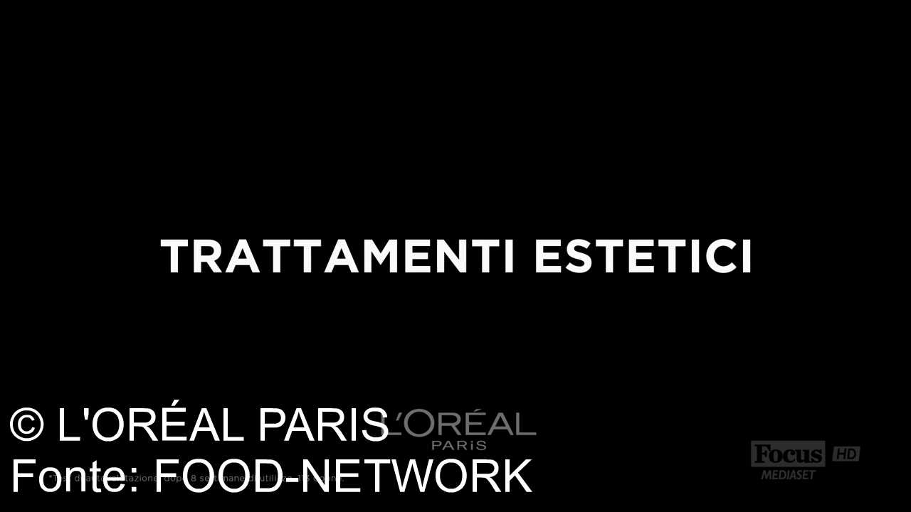 Sfondo nero con il testo "TRATTAMENTI ESTETICI" in bianco al centro. In basso, scritta "L'ORÉAL PARIS". In calce, piccolo testo: "Test di autovalutazione, dopo 8 settimane di utilizzo, 113 donne." In basso a destra, logo "Focus HD Mediaset".