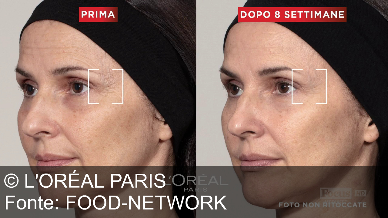 Due flaconi di prodotti cosmetici L'Oréal Paris sono su sfondo rosso. Uno è un flacone con contagocce, l'altro è un barattolo. Si leggono le scritte "REVITALIFT", "LASER" e "ROUTINE ANTI-ETÀ". A sinistra c'è il logo L'Oréal, in basso a destra il logo di Focus HD Mediaset. Linee rosse verticali brillano sullo sfondo.