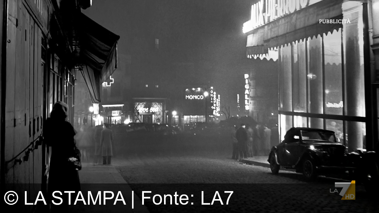 Strada di notte con edifici illuminati. Una macchina parcheggiata vicino a una vetrina. Persone in lontananza, insegne luminose "Monico" e "Pigalle". Atmosfera retrò, parzialmente oscurata dalla nebbia. Si leggono le parole “PUBBLICITÀ” e “LA7 HD” in alto a destra.