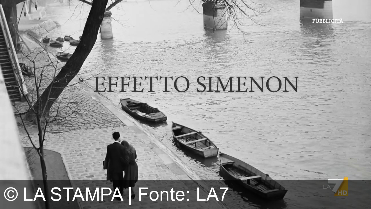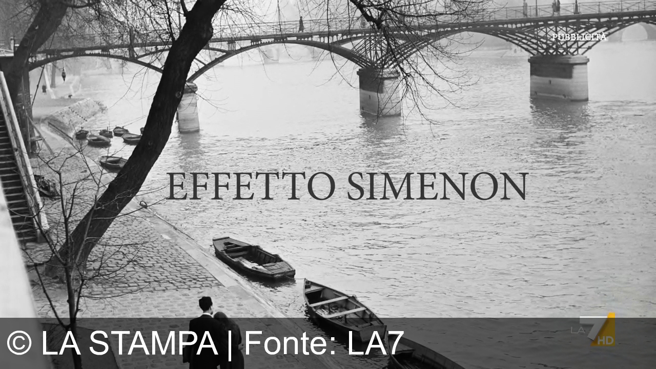 Una coppia cammina lungo un fiume su un percorso di pietra, affiancata da quattro barche ormeggiate. Un albero spoglio si estende sopra il sentiero. Sulla sinistra ci sono delle scale. La scritta "EFFETTO SIMENON" è centrata sopra la scena. In alto a destra c’è scritto "PUBBLICITÀ". Nell'angolo in basso a destra si vede il logo "LA7 HD".