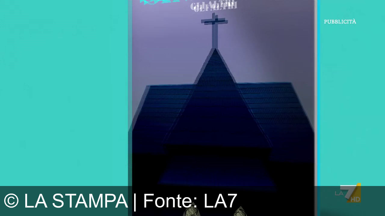 Una chiesa con un tetto a spiovente e una croce in cima. Sfondo viola, due finestre illuminate in basso. Scritta "Gli Altri" nella parte superiore. Bordo verde a sinistra e scritta "PUBBLICITÀ" a destra. Logo "LA7 HD" in basso a destra.