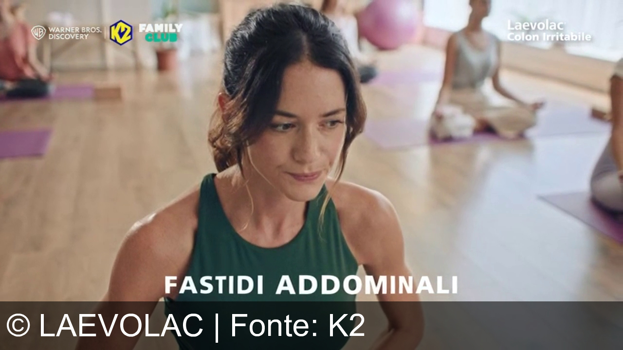 Una donna con i capelli castani è in primo piano, indossa una canotta verde. È in una sala da yoga con altre persone sullo sfondo. Sullo schermo c'è la scritta "Fastidi Addominali" e una pubblicità per un prodotto intestinale. In alto ci sono i loghi Warner Bros Discovery e K2 Family Club.