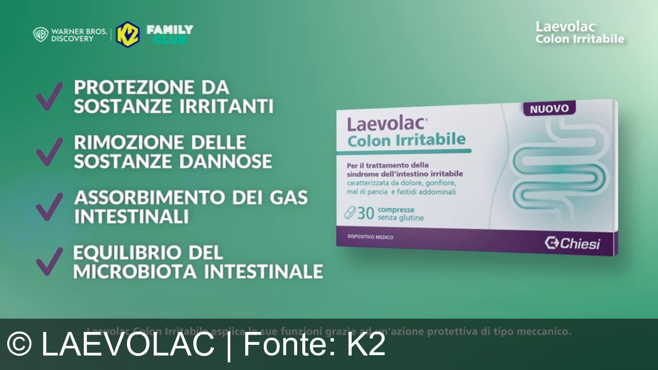 Schermata di un annuncio per un prodotto chiamato Laevolac Colon Irritabile. Sfondo verde, a sinistra c'è un elenco di benefici: protezione da sostanze irritanti, rimozione di sostanze dannose, assorbimento dei gas intestinali, equilibrio del microbiota intestinale. A destra c'è l’immagine della scatola del prodotto. In alto a sinistra loghi Warner Bros. e K2.