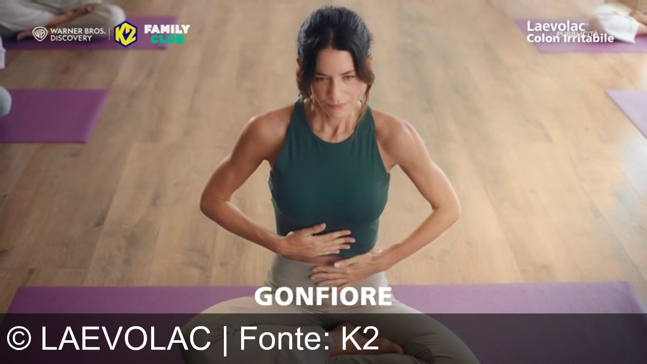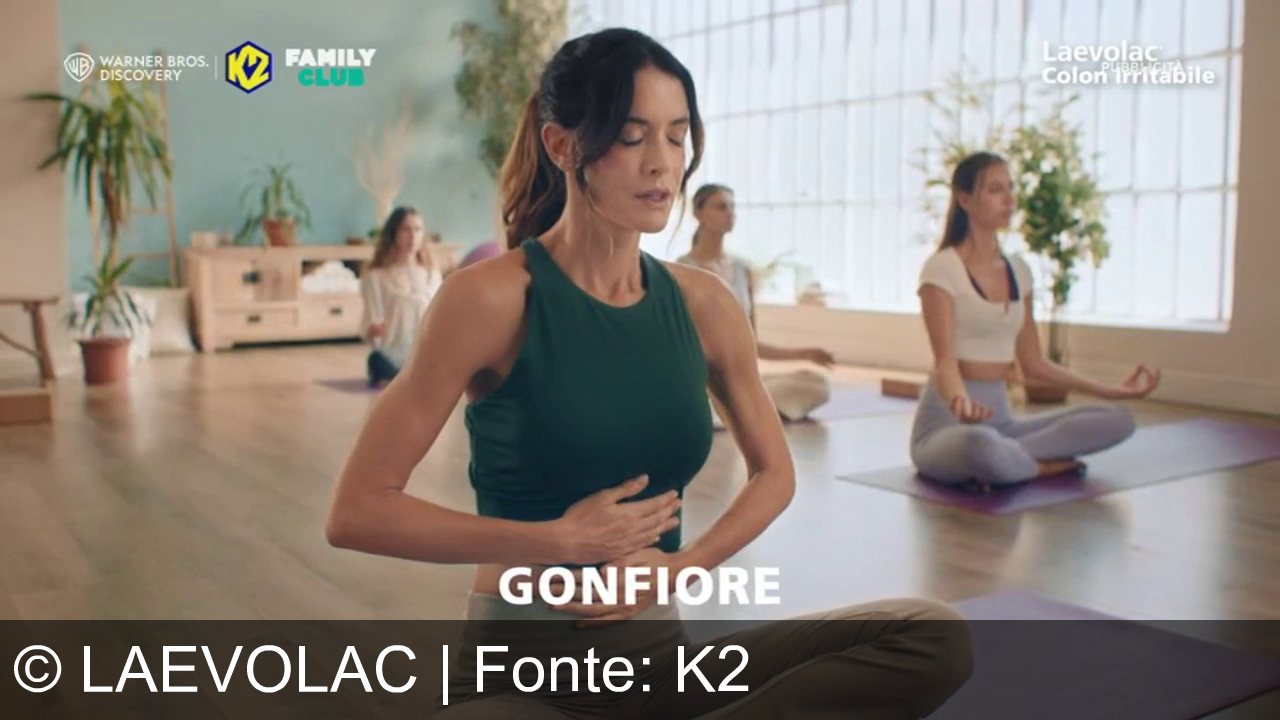 Una donna è seduta a gambe incrociate su un tappetino viola, con le mani sull'addome. Indossa un top verde e pantaloni chiari. Sopra di lei, il testo "GONFIORE". Sullo sfondo ci sono altre persone su tappetini. I loghi "Warner Bros. Discovery" e "K2 Family Club" in alto a sinistra, mentre "Laevolac Colon Irritabile" in alto a destra.