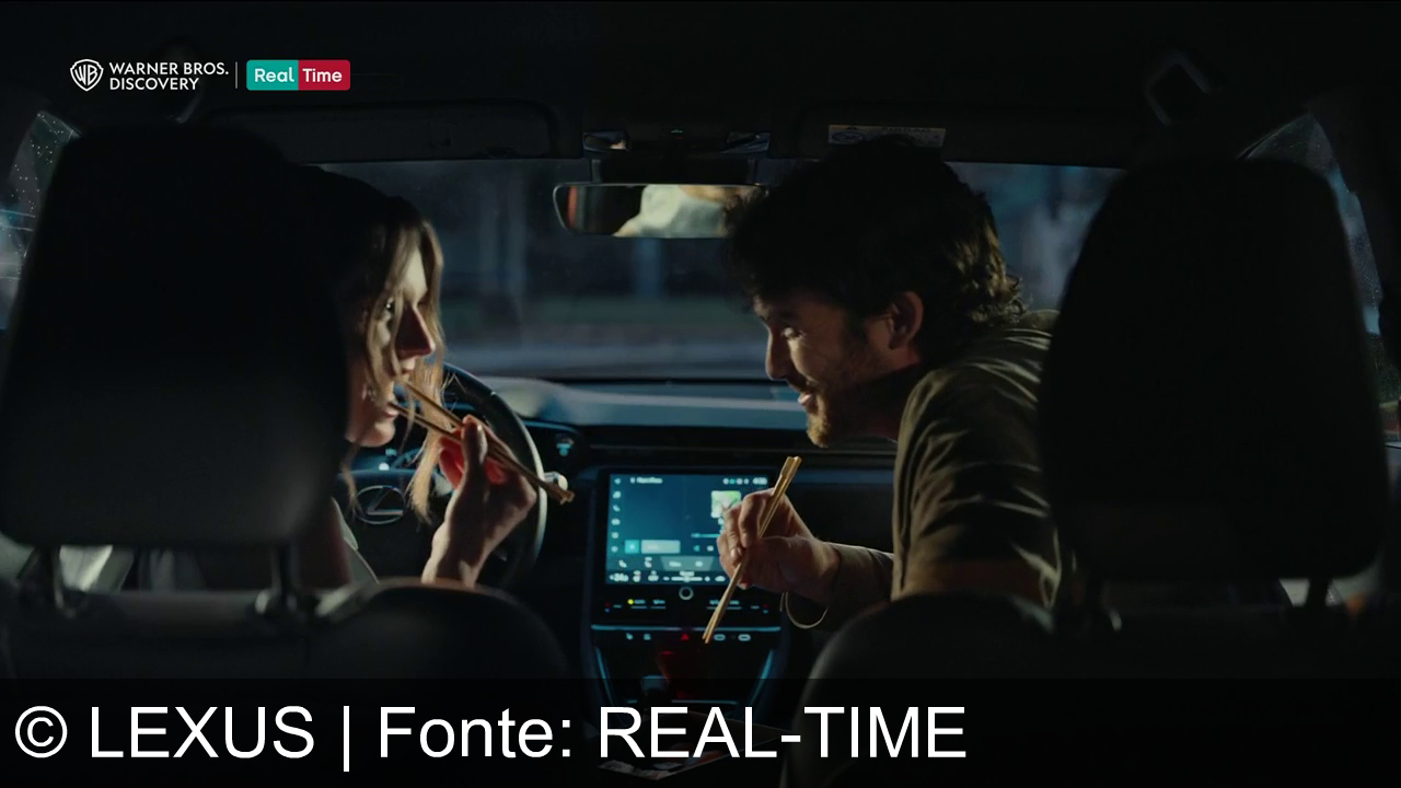 Due persone sedute nei sedili anteriori di un'auto. Stanno mangiando con le bacchette e sembrano sorridere l'uno all'altro. Lo schermo del cruscotto è acceso con vari comandi visibili. C'è del cibo tra di loro sul cruscotto. L'etichetta Warner Bros. Discovery e Real Time è in alto a sinistra.