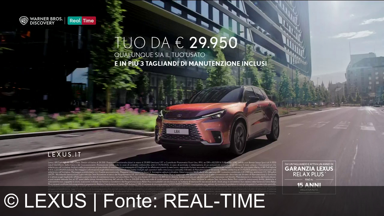 Una macchina arancione viaggia su una strada cittadina affiancata da edifici moderni e alberi. Testo promozionale in alto offre l'auto a partire da €29,950 con 3 tagliandi di manutenzione. Logo Warner Bros. Discovery e Real Time in alto a sinistra. In basso il sito web lexus.it e altri dettagli. Garanzia con durata di 15 anni è menzionata a destra.