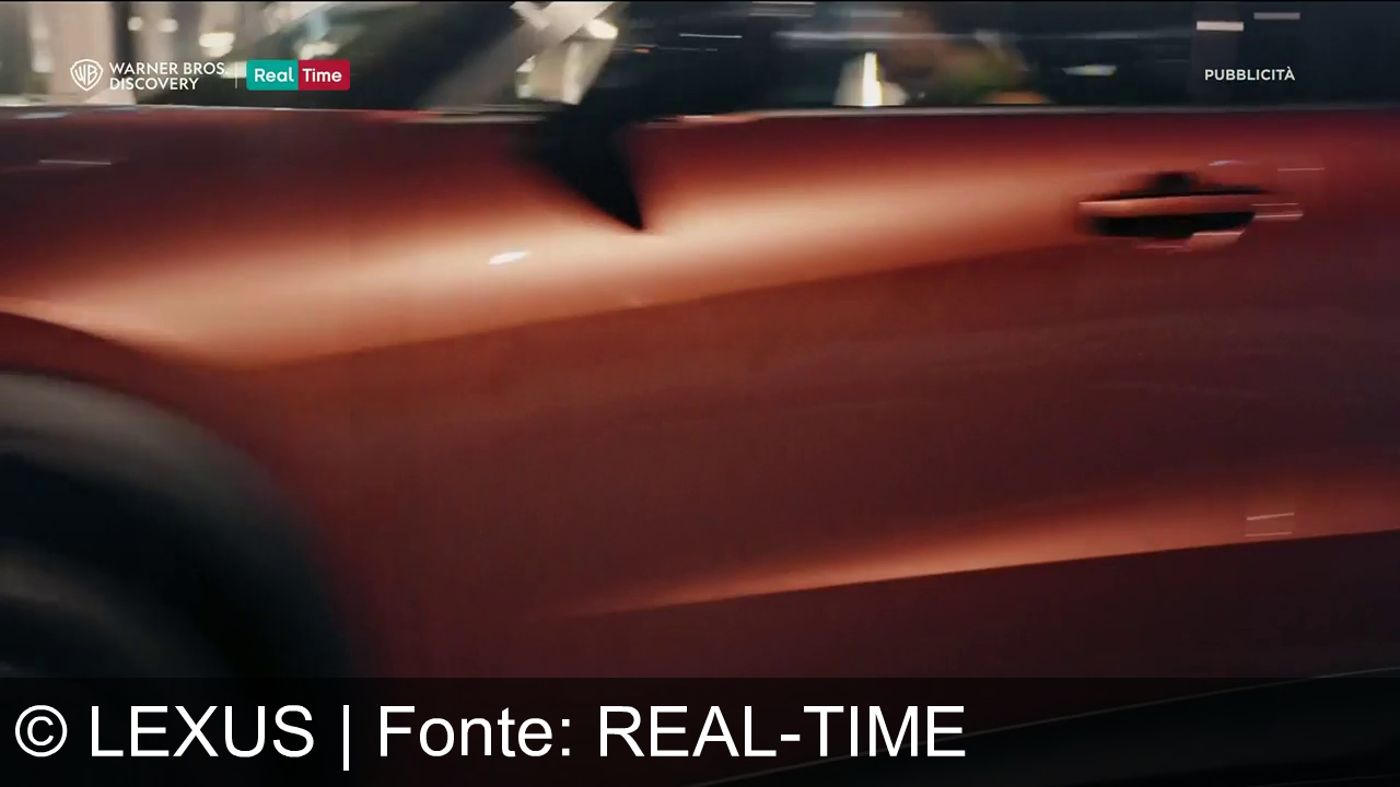 Una macchina color rame in movimento su una strada illuminata. In alto, i loghi di Warner Bros Discovery e Real Time. In alto a destra, la scritta "PUBBLICITÀ."