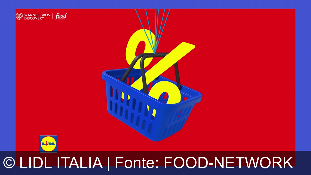 Un cesto della spesa blu con un grande simbolo di percentuale giallo inserito. Sopra ci sono fili di un paracadute. Sfondo rosso con bordi blu. Loghi di Warner Bros. Discovery e Food Network in alto a sinistra, e logo Lidl in basso a sinistra.