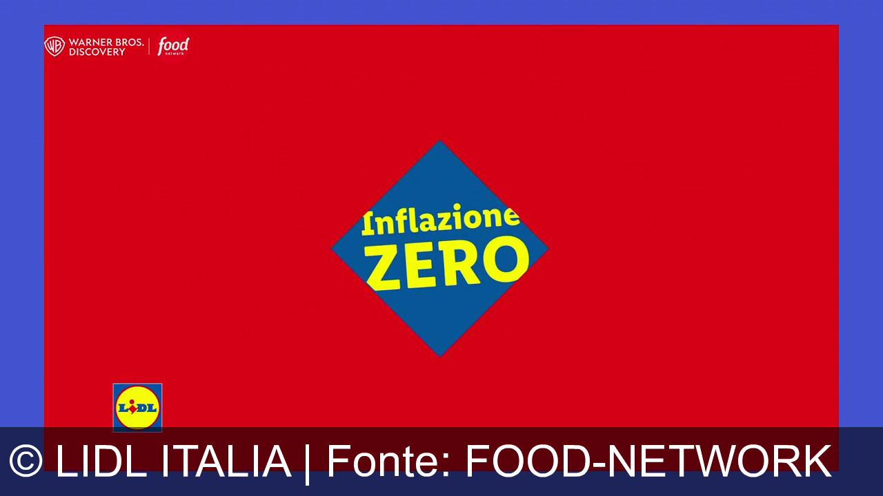 Sfondo rosso con un riquadro blu al centro, scritta gialla "Inflazione ZERO". Logo Lidl in basso a sinistra. Angolo superiore sinistro con loghi Warner Bros. Discovery e Food Network. Bordo blu sottile lungo il margine.