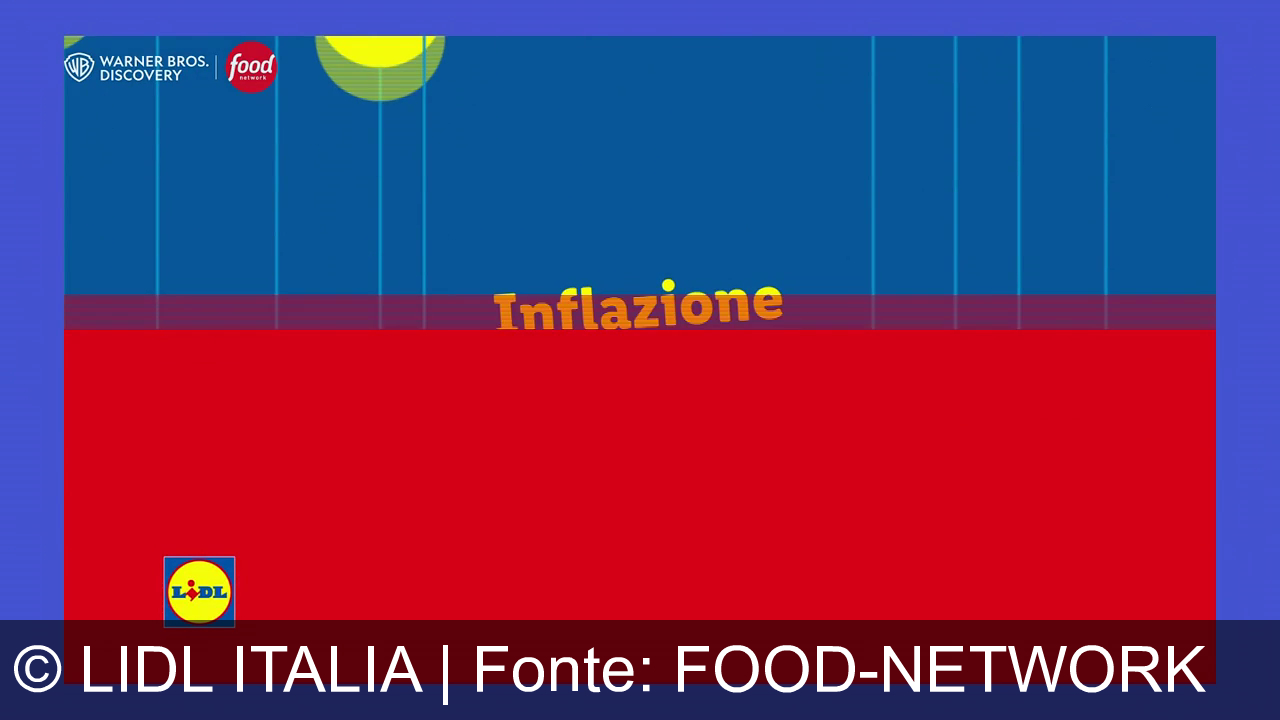 Sfondo blu sopra e rosso sotto, con scritta "Inflazione" al centro. Logo Warner Bros. Discovery e Food Network in alto a sinistra, logo Lidl in basso a sinistra. Cerchio giallo in alto a destra.