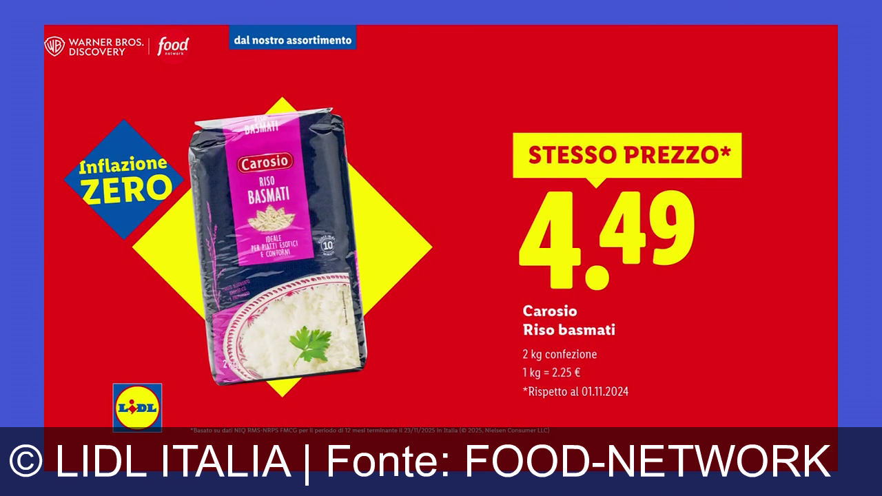 Il pacco di riso basmati Carosio su sfondo rosso, prezzo 4,49 €, scritta "inflazione zero", marchio Lidl in basso a sinistra. Quantità confezione: 2 kg, prezzo al kg: 2,25 €. Testo "stesso prezzo", grafica gialla e blu, marchio Warner Bros. Discovery e Food Network in alto a sinistra.