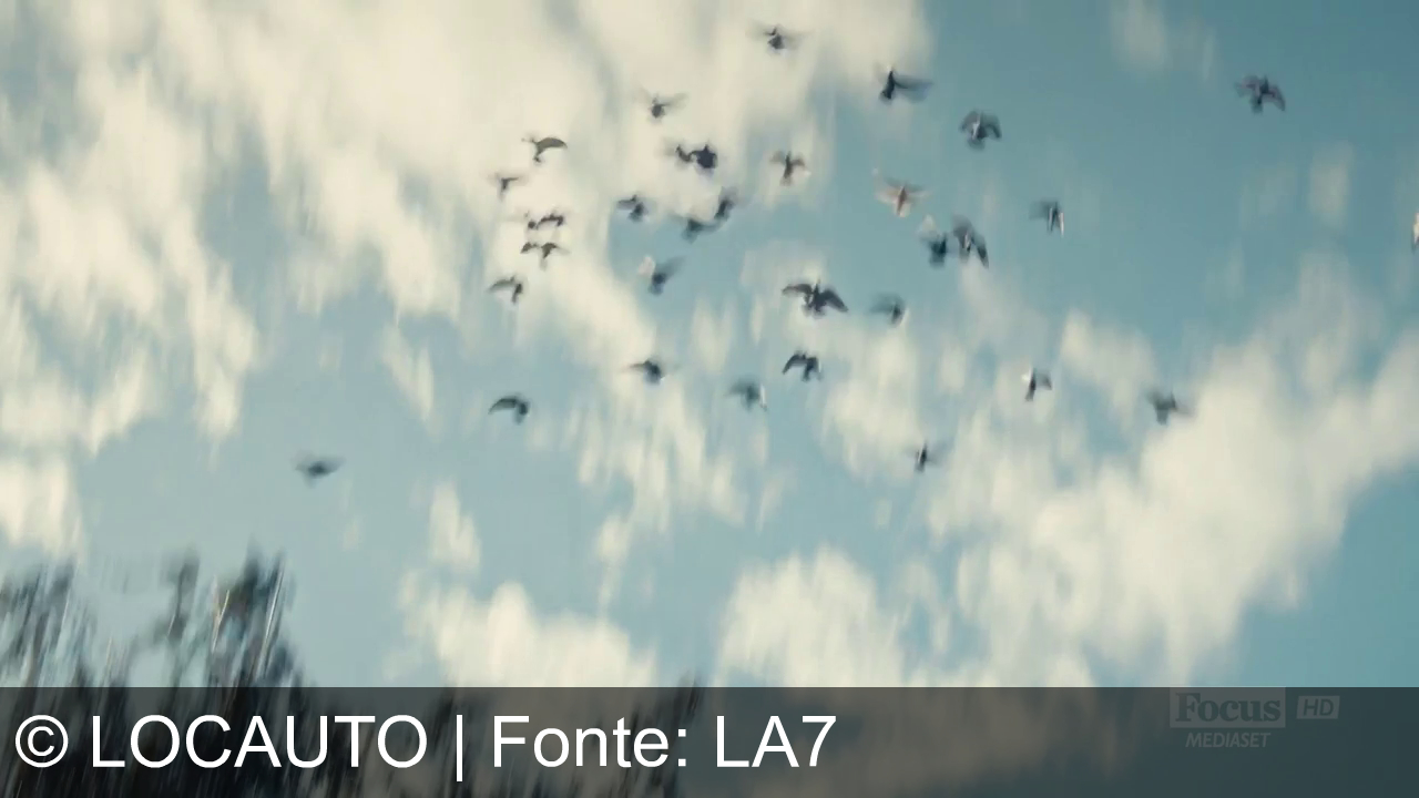 Un gruppo di uccelli vola nel cielo azzurro con qualche nuvola sparsa, mentre in basso si vede un po’ di vegetazione sfocata.