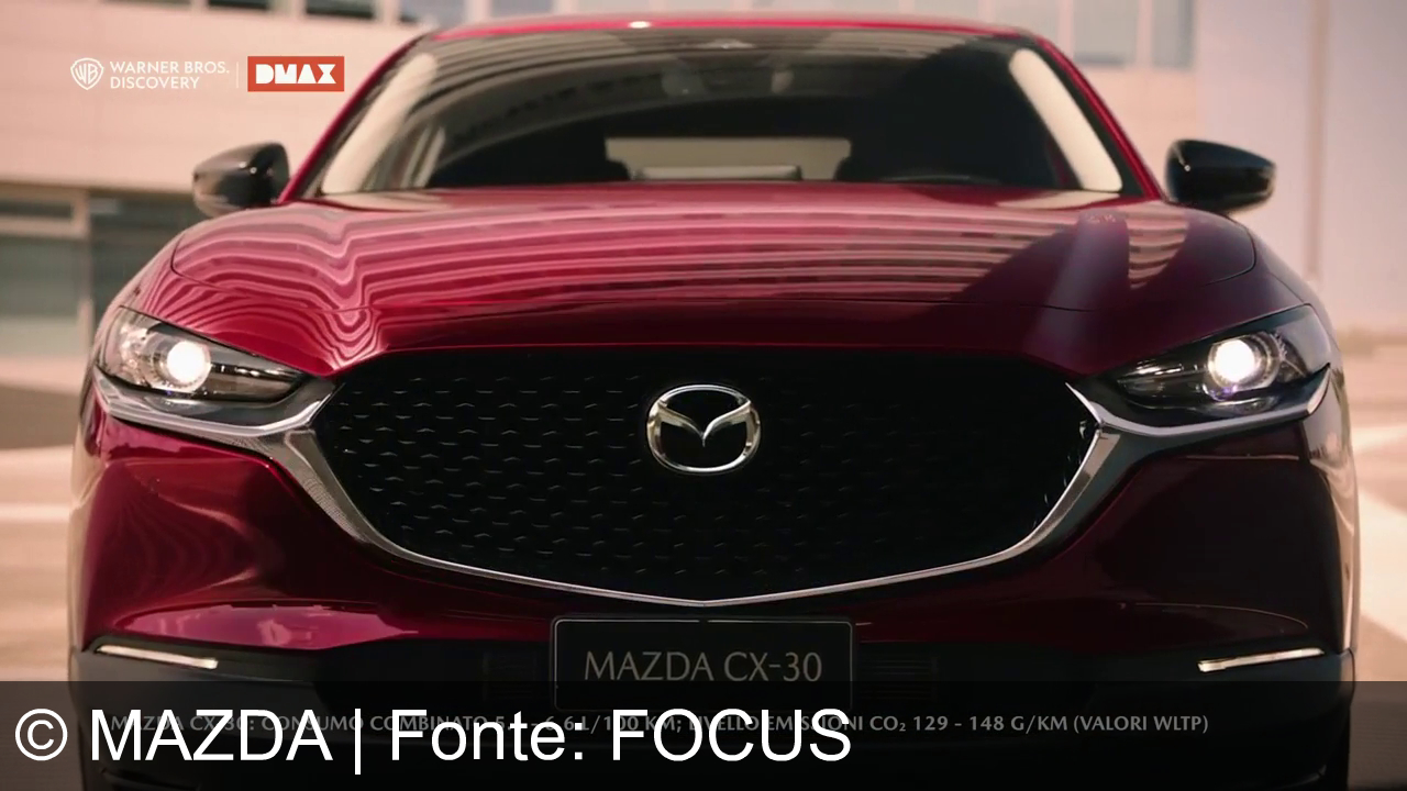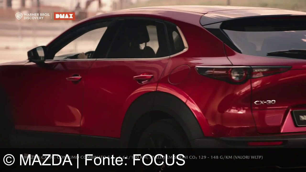 Una Mazda CX-30 rossa parcheggiata di lato. Nella parte superiore dello schermo ci sono i loghi di Warner Bros. Discovery e DMAX. Nella parte inferiore, un testo in italiano specifica il consumo combinato e le emissioni di CO2 del veicolo.