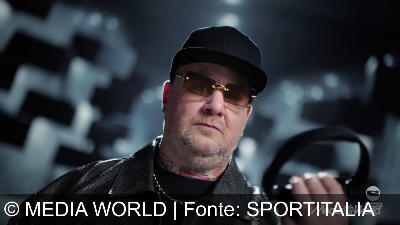 Un uomo con occhiali da sole e cappello nero tiene delle cuffie in mano. Indossa una giacca di pelle e una collana dorata. Sfondo scuro con forme sfocate. Logo "MediaWorld" in basso a destra.