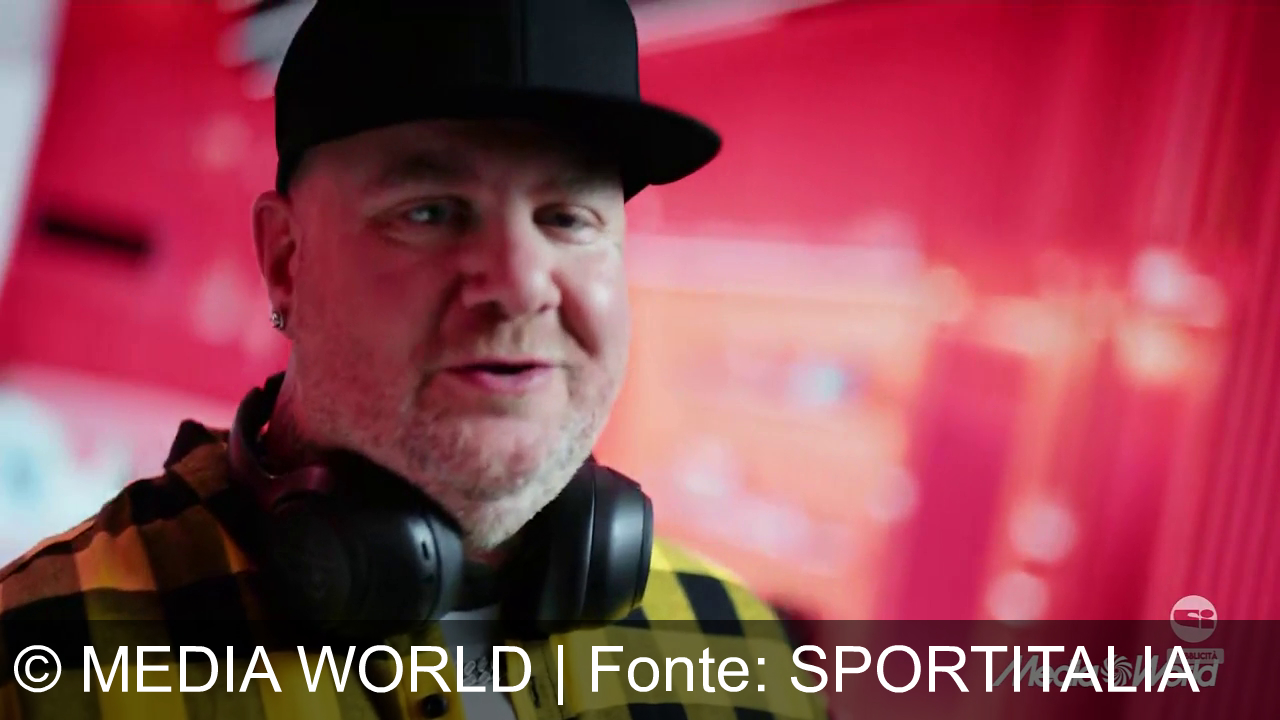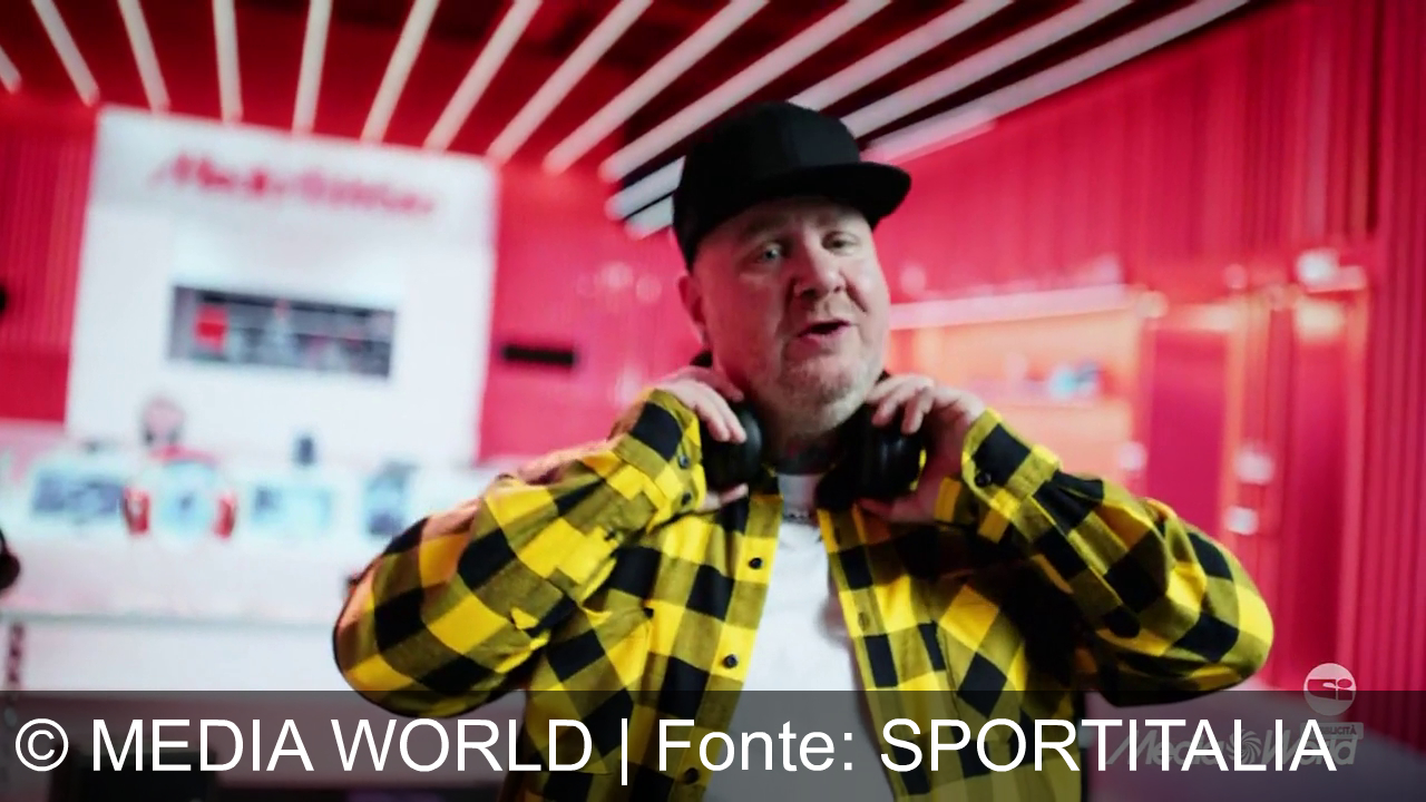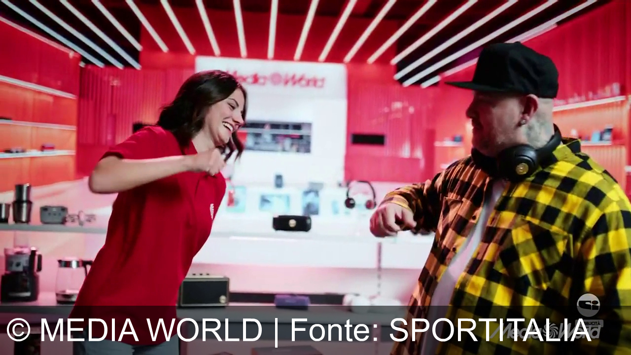 Un uomo con una camicia a quadri gialla e nera e un cappellino nero indossa cuffie al collo. Lo sfondo è rosso con luci al soffitto. In basso a destra, c'è il logo di MediaWorld.