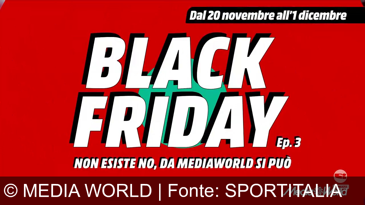 Sfondo rosso con testo bianco e nero che annuncia il Black Friday dal 20 novembre all'1 dicembre. Frase "NON ESISTE NO, DA MEDIAWORLD SI PUÒ" al centro. Logo MediaWorld in basso a destra.
