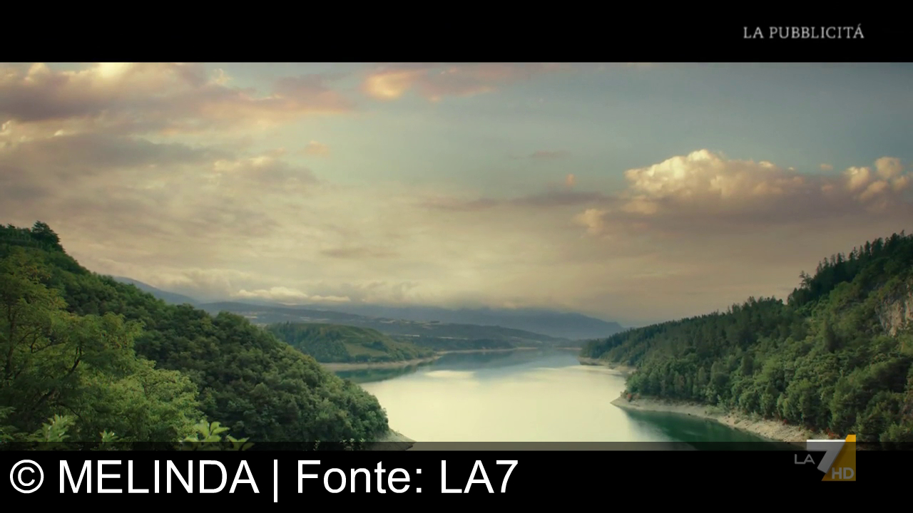 Un fiume scorre tra due colline coperte di alberi verdi. Il cielo è nuvoloso con tonalità di rosa e giallo. Sull'acqua si riflettono le nuvole creando un effetto morbido. Sul lato destro in basso c’è il logo “LA7 HD”. In alto a destra c’è scritto "LA PUBBLICITÀ".