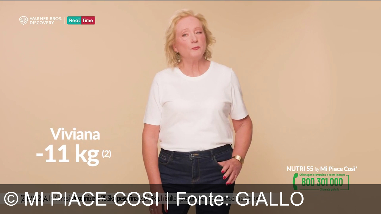 Una donna con capelli biondi indossa una maglietta bianca e jeans. Sullo sfondo beige, il testo dice "Viviana -11 kg". Ci sono dettagli su IMC e peso iniziale e finale. Il logo di Warner Bros. Discovery e il nome del programma "Real Time" sono in alto a sinistra. Un numero di telefono per informazioni è in basso a destra, legato a "NUTRI 55 by Mi Piace Così".