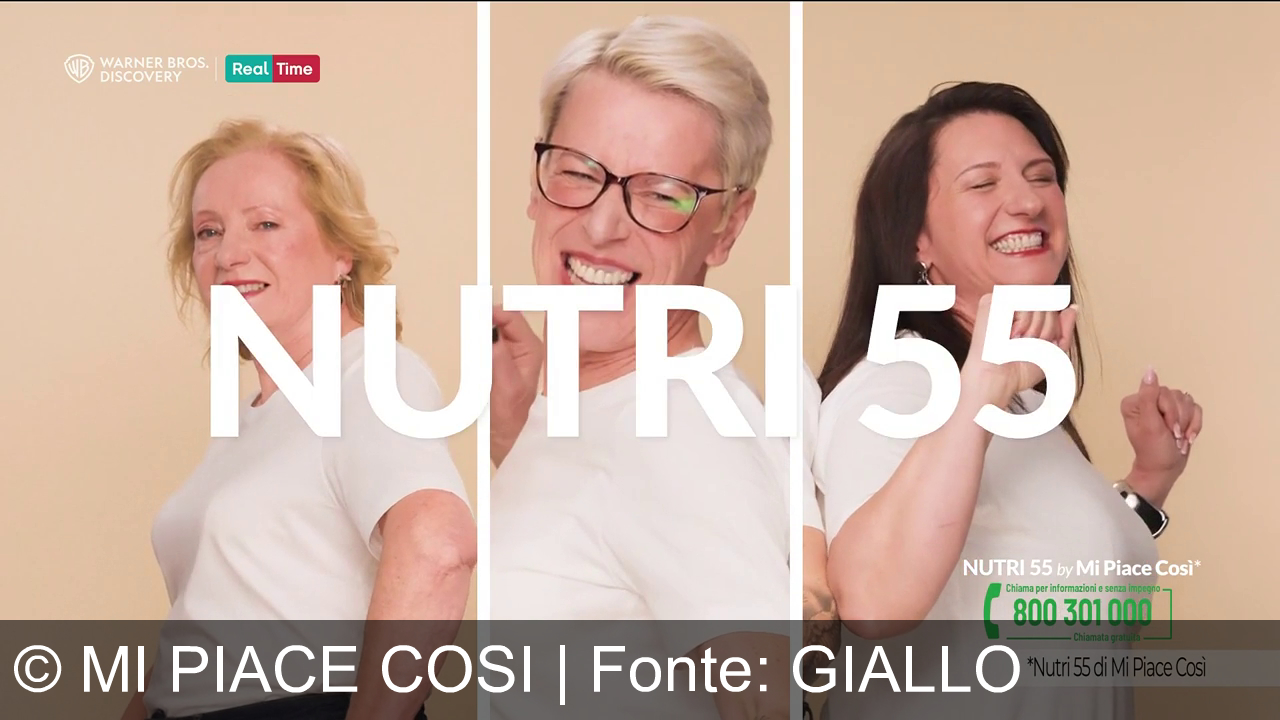 Tre donne sorridenti con magliette bianche su sfondo beige. Al centro della scena, la scritta "NUTRI 55" in grande. In alto a sinistra, il logo Warner Bros. Discovery e Real Time. In basso a destra, un numero verde per contatti con la dicitura "Nutri 55 di Mi Piace Così".