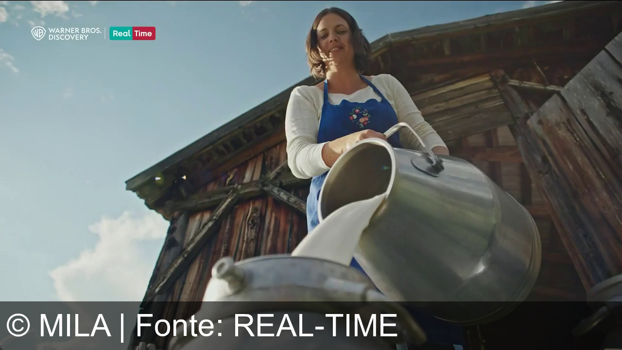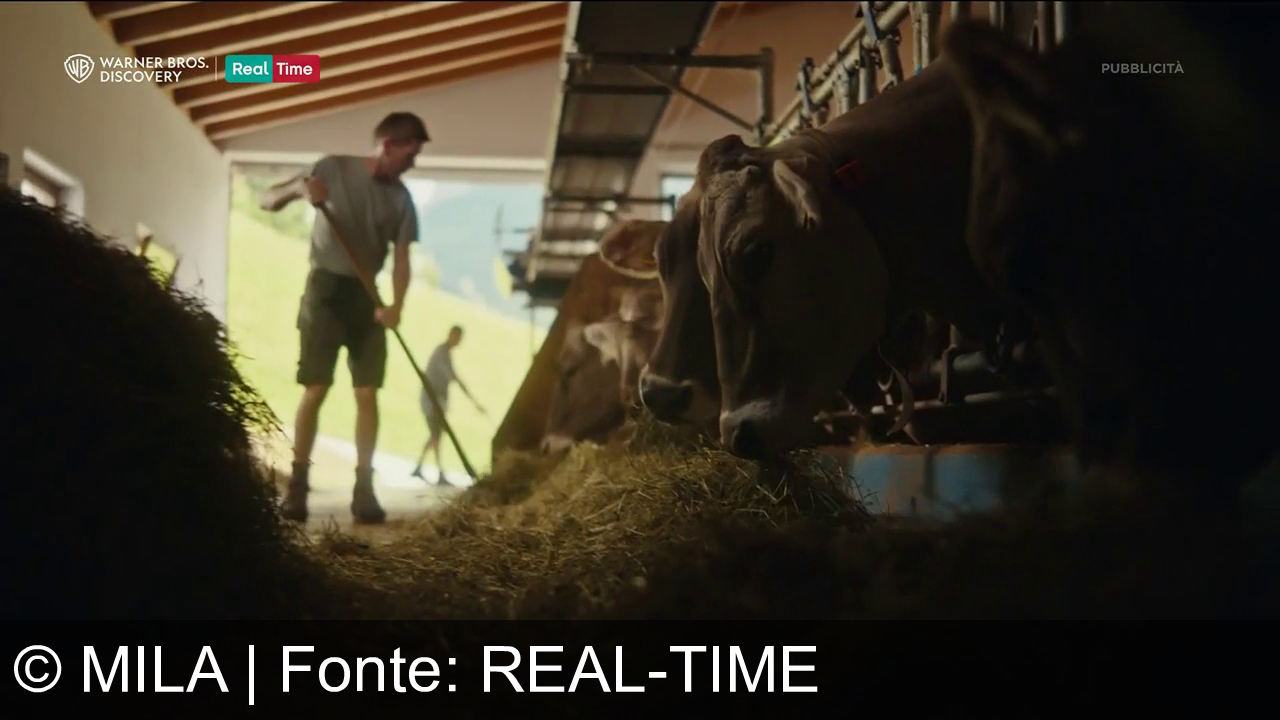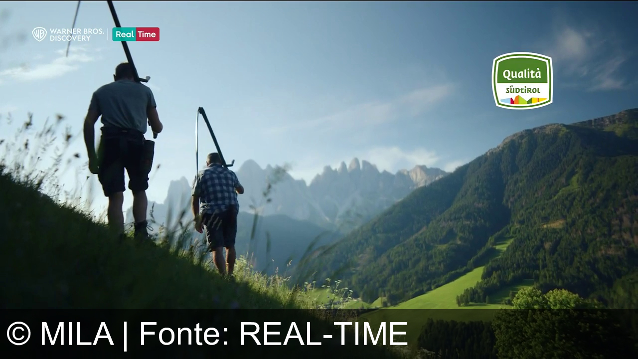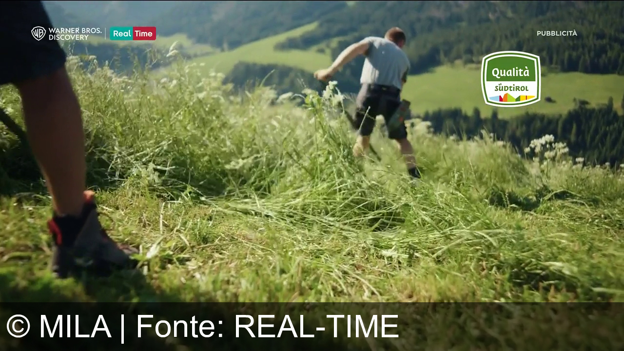 Una persona cammina su un prato in montagna, con erba alta intorno. Indossa pantaloni corti e una maglietta. In lontananza, ci sono colline verdi. Sopra a destra c'è un logo con la scritta "Qualità Südtirol". In alto a sinistra, i loghi di Warner Bros. Discovery e Real Time.