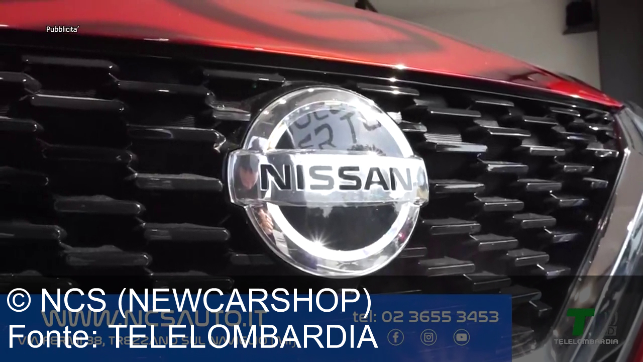 Il logo brillante di Nissan su una griglia nera è al centro. Sotto c’è una barra blu con l'indirizzo del sito ncsaauto.it, telefono, indirizzo a Trezzano sul Naviglio, e loghi dei social. In alto, piccola scritta "Pubblicità". In basso a destra, il marchio "Telelombardia".