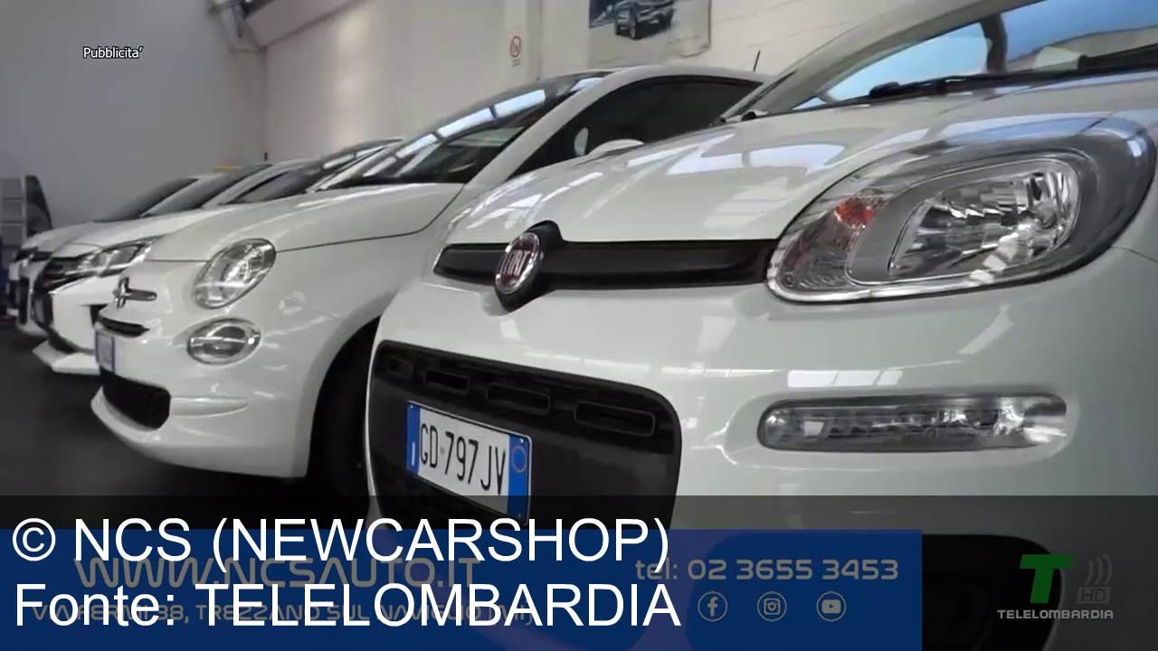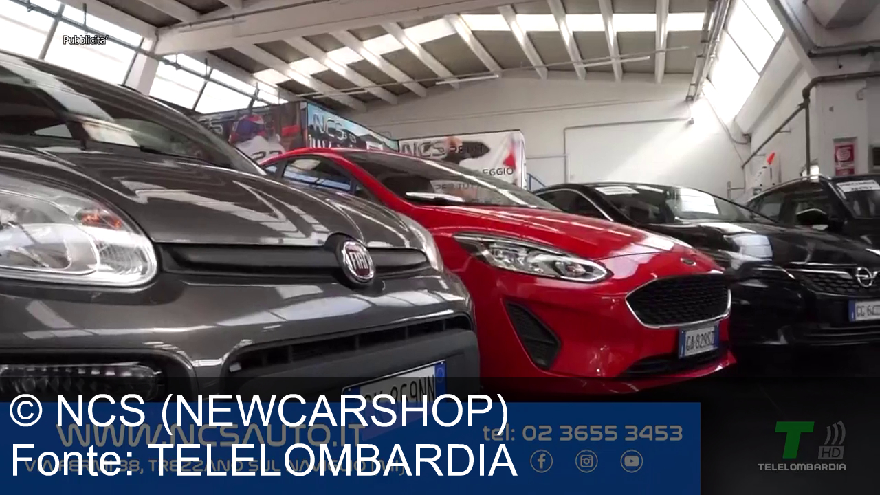 In un salone auto ci sono varie macchine parcheggiate: una Fiat grigia, una Ford rossa e un'altra nera. In sovrimpressione, ci sono informazioni sul sito web, numero di telefono e indirizzo del concessionario NCS Auto a Trezzano sul Naviglio. Sul logo in basso a destra, "Telelombardia" è visibile con "Pubblicità" in alto a sinistra.