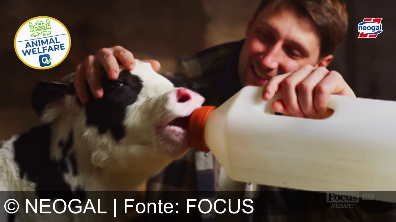 Un uomo dà da bere a un vitellino con un biberon grande e lo accarezza sulla testa. Il vitellino succhia il latte con forza e l’uomo sorride mentre tiene la bottiglia.