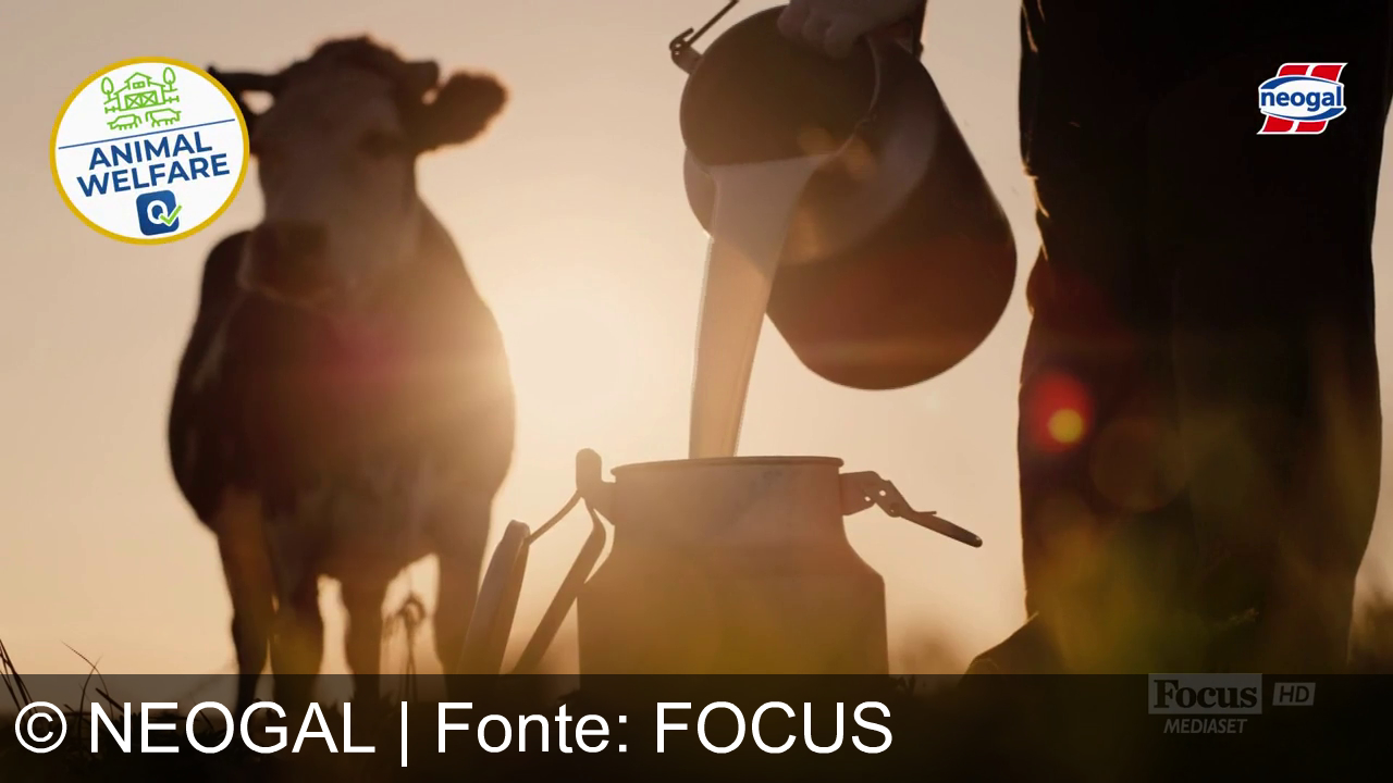 Una mucca sta ferma nel prato al tramonto mentre una persona versa latte da un secchio in un bidone metallico. La luce del sole passa tra l’erba e crea un’atmosfera calda e rurale.
