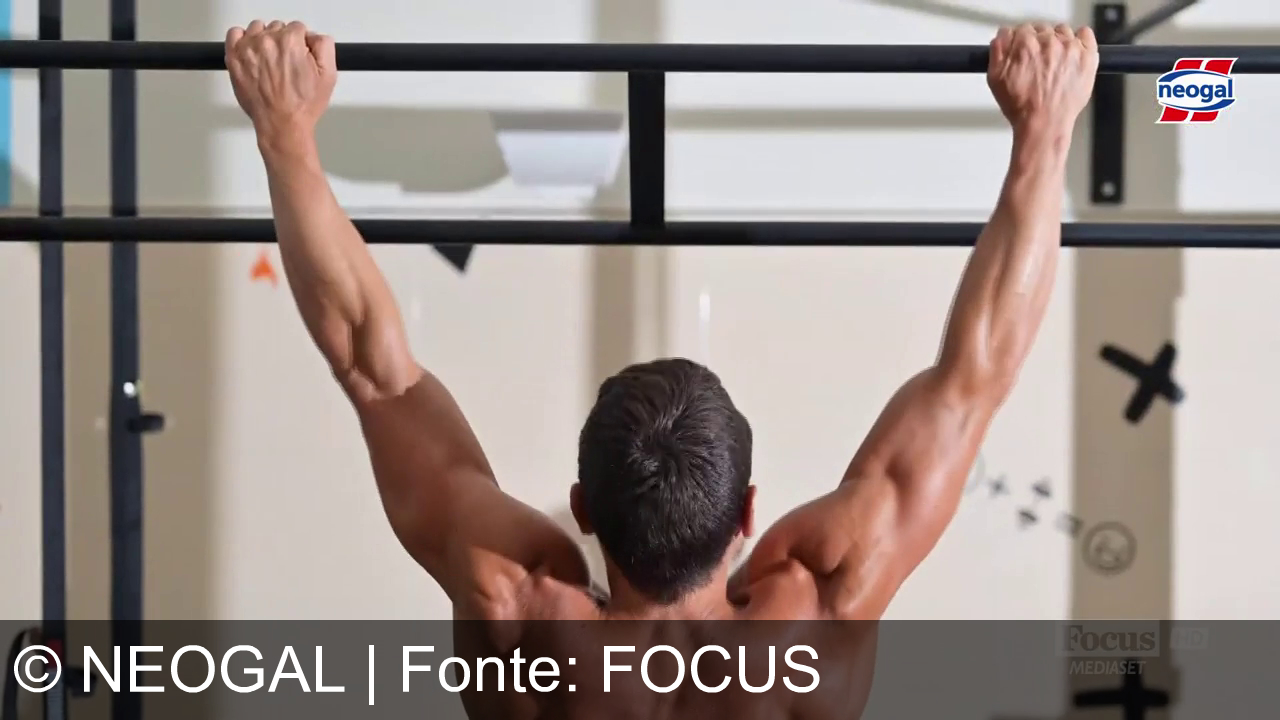 Un uomo a torso nudo fa trazioni alla sbarra in palestra, con i muscoli della schiena ben tesi e le braccia allungate mentre afferra la barra sopra la testa.