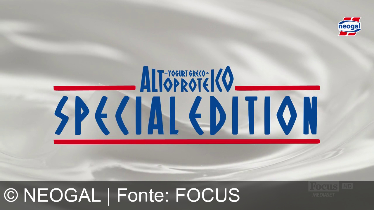 Sfondo cremoso bianco con la scritta in blu e rosso “Yogurt Greco Altoproteico Special Edition”. In alto a destra appare il logo neogal.