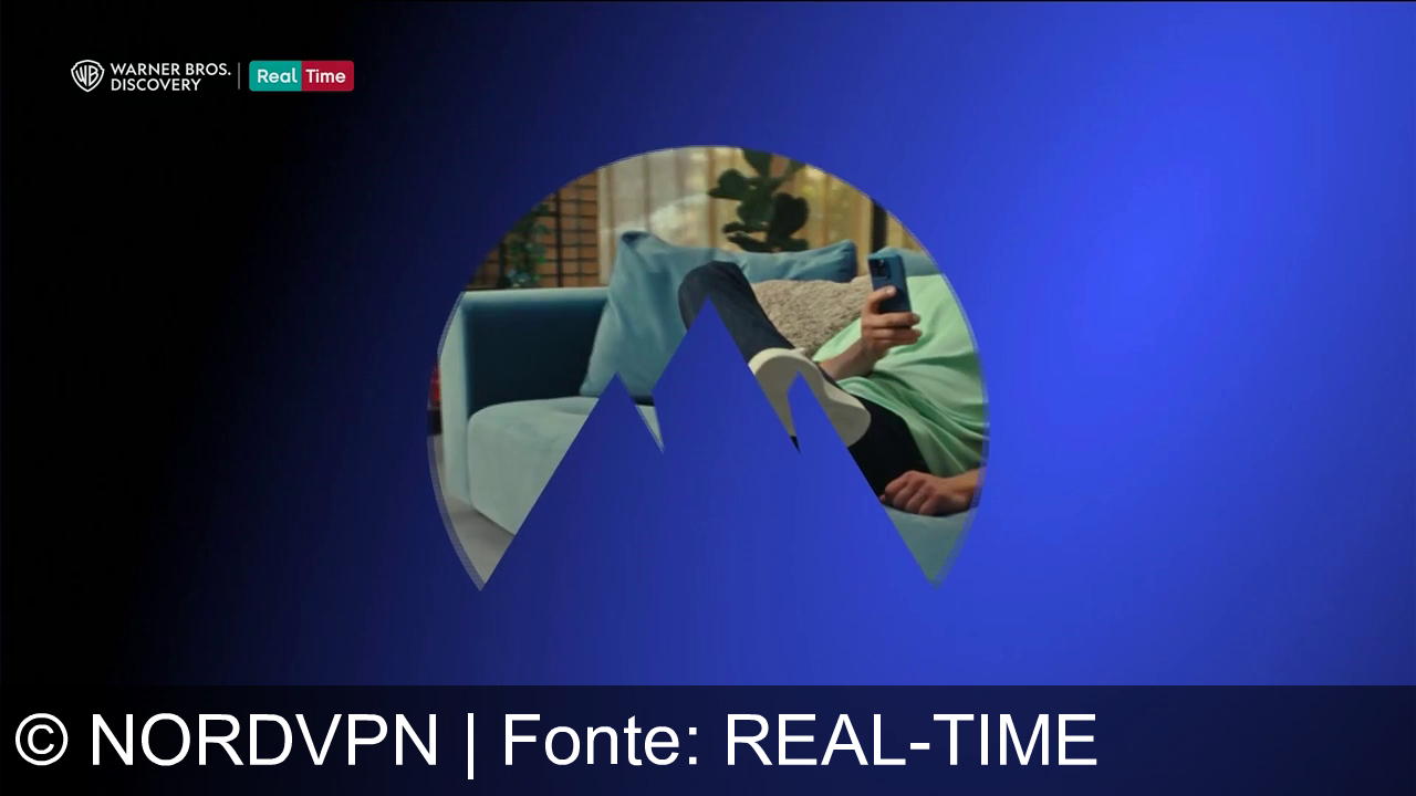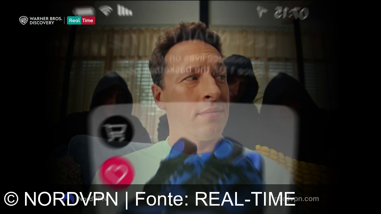 Un uomo guarda di lato mentre dietro di lui ci sono persone incappucciate. In primo piano, indossa dei guanti blu che toccano un display virtuale con icone, tra cui un carrello e un cuore. In alto a sinistra, loghi di Warner Bros. Discovery e Real Time. In basso, il logo NordVPN e l'indirizzo web nordvpn.com.