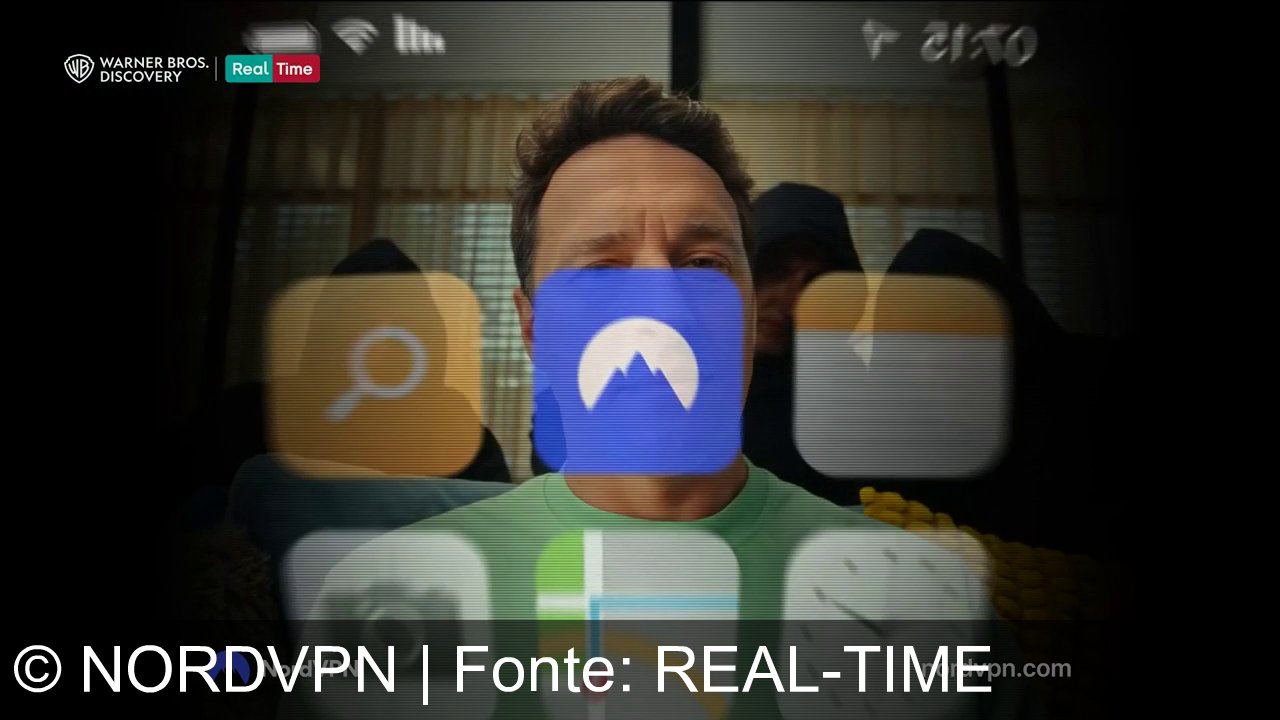 Un uomo al centro indossa una maglietta verde. Icône di app mobili sono sovrapposte al suo volto, inclusa una blu con un disegno bianco simile a una montagna. Dietro di lui, due persone in abiti scuri con cappucci. In alto a sinistra, loghi di Warner Bros Discovery e Real Time. In basso, il logo di NordVPN e il sito web.