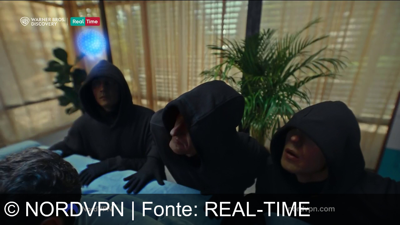 Tre persone con cappucci neri siedono accanto a un letto blu. Indossano guanti neri e guardano nella stessa direzione. Sullo sfondo ci sono delle tende e una pianta verde. In alto a sinistra ci sono i loghi di Warner Bros Discovery e Real Time. In basso, il logo di NordVPN.