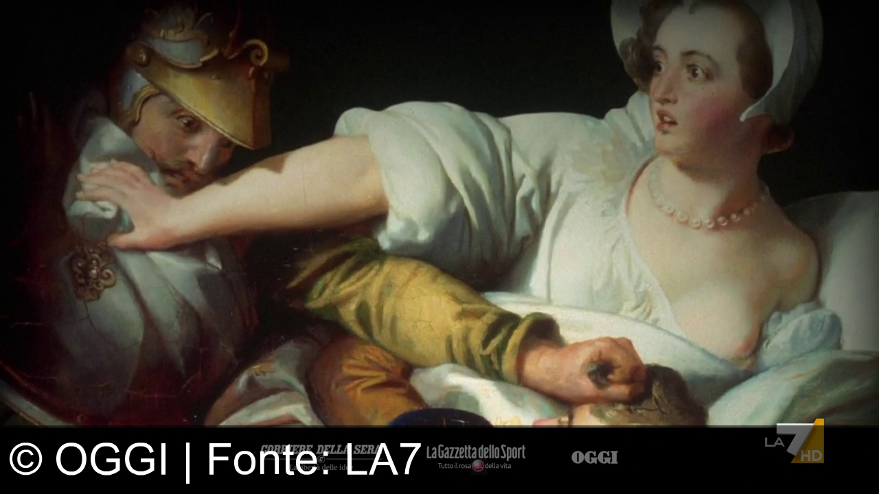 Un dipinto con un soldato in armatura con elmo e una donna con un vestito bianco e collana di perle. La donna ha un'espressione sorpresa, il soldato è chino verso di lei. In basso, loghi di "Corriere della Sera", "La Gazzetta dello Sport" e "Oggi", con il logo "La7 HD" a destra.