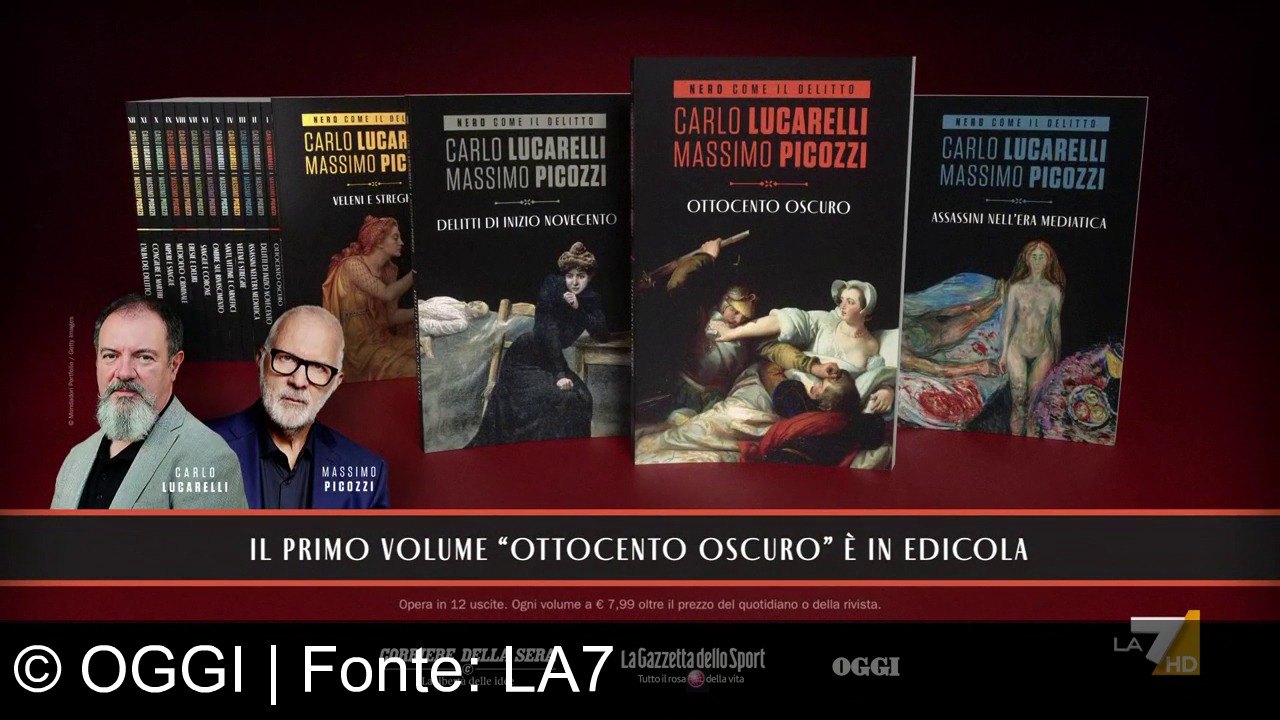 Due ritratti di Carlo Lucarelli e Massimo Picozzi. Diversi libri della serie "Nero Come il Delitto" sono allineati. C'è un testo che dice "Il primo volume ‘Ottocento Oscuro’ è in edicola". In basso, loghi di Corriere della Sera, La Gazzetta dello Sport, Oggi e La7 HD. Sfondo rosso scuro.