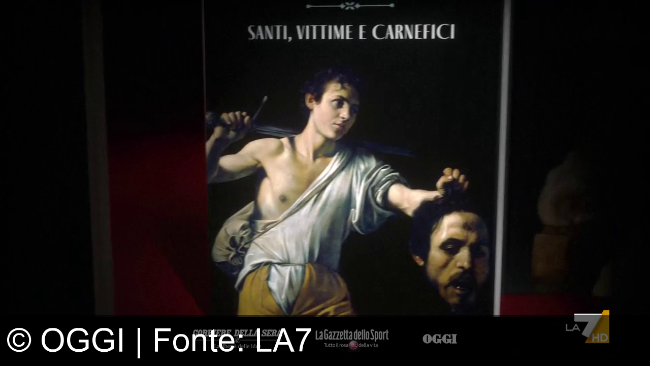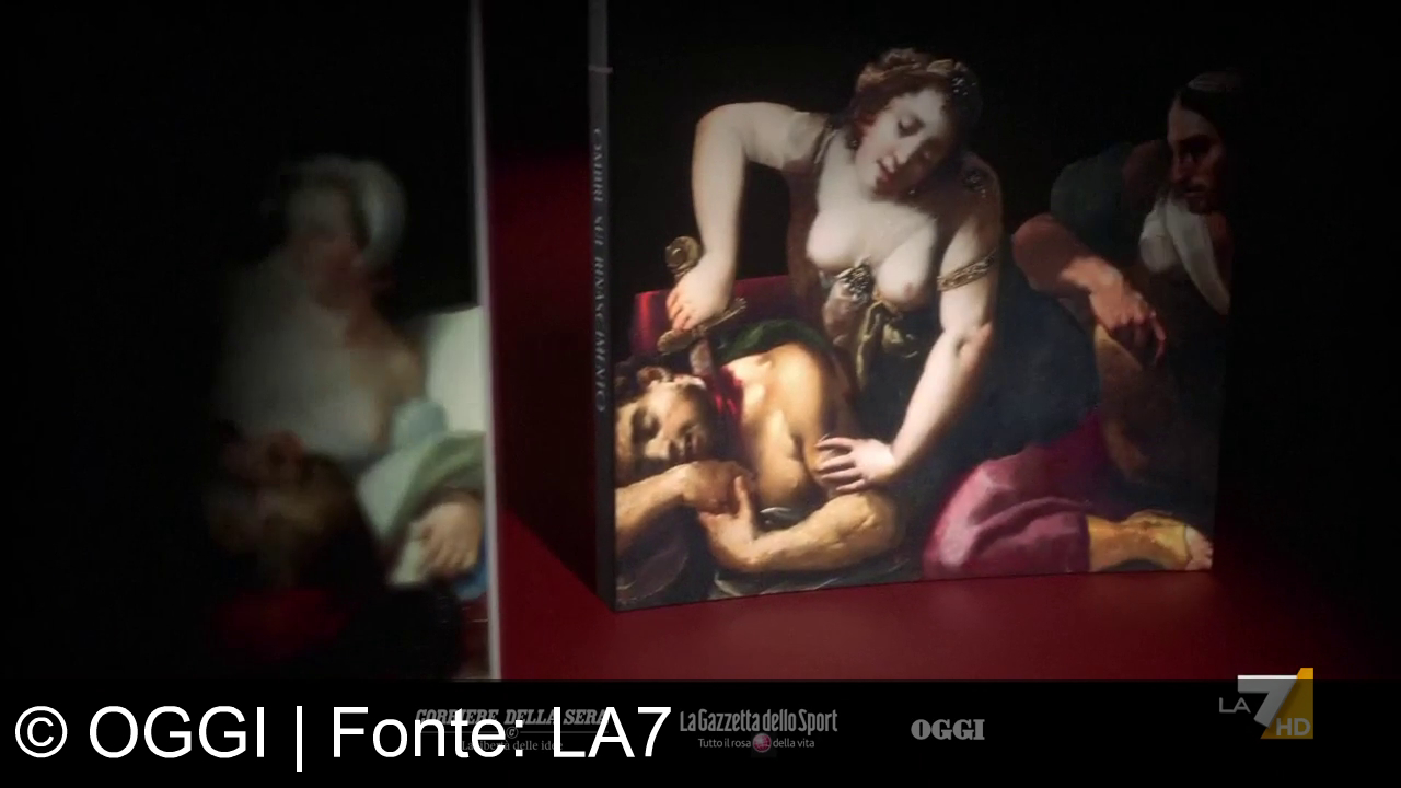 Inquadratura di un dipinto con una donna che sembra tagliare la testa a un uomo. I colori sono intensi con dominanza di rosso e nero. L'immagine è su sfondo nero e ci sono loghi in basso: Corriere della Sera, La Gazzetta dello Sport, Oggi, e La7 HD.