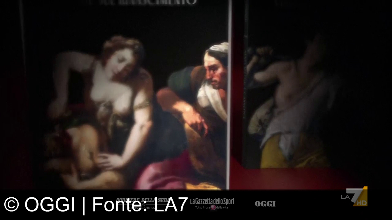 Un dipinto rinascimentale con due figure, una donna a sinistra e, vicino a lei, un'altra persona che guarda con attenzione. In basso, loghi e scritte: "CORRIERE DELLA SERA", "La Gazzetta dello Sport", e "OGGI". In basso a destra, logo "LA7 HD". Colori scuri e dettagli evidenti nel dipinto.