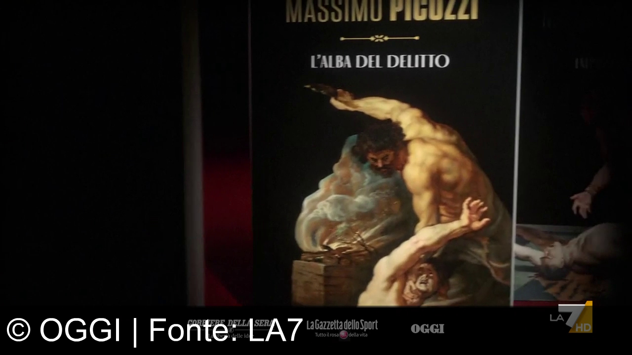 La copertina di un libro con il nome "Massimo Picozzi" e il titolo "L'alba del delitto". C'è un'immagine con due figure, una sopra l'altra. Il logo di "Corriere della Sera", "La Gazzetta dello Sport", "Oggi" in basso. "La 7 HD" nell'angolo inferiore destro.