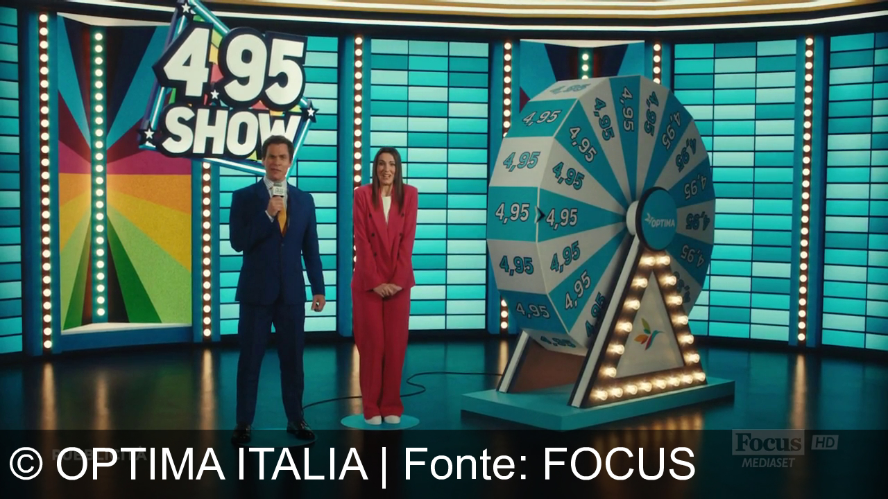 Un uomo in abito blu parla al microfono mentre guarda una donna in completo rosa. Lei sta vicino a una grande ruota colorata piena di numeri 4,95. Il set è pieno di luci e colori in stile show televisivo.